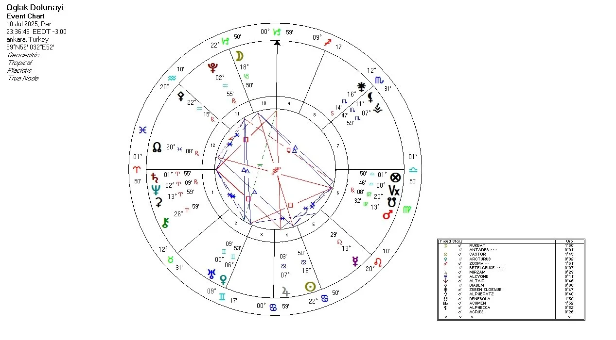 Dolunay, 18 derece Oğlak burcunda gerçekleşiyor. Bu derecede Ay, Rukbat sabit yıldızıyla kavuşumda ve Antares sabit yıldızı ile paralel açıda yer alıyor. Bu sabit yıldızlar, dolunayın temasında derinleşmemiz için bize spesifik temalar vermektedir.